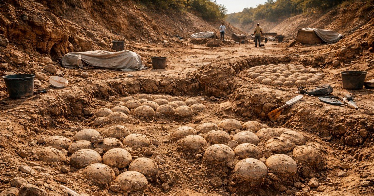 • Los huevos fosilizados están excepcionalmente conservados y forman varios nidos agrupados.