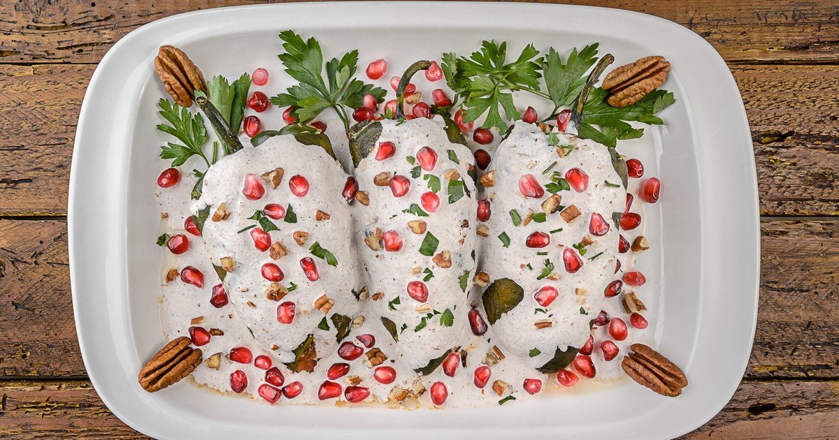 • Se trata de chiles grandes, asados y pelados, rellenos con un picadillo agridulce y bañados con una salsa de nuez.